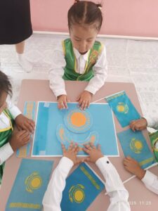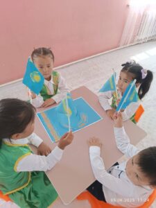 Тәрбие сағаты Қазақстан Республикасының Әнұранын орындаумен басталды. Балалар сап түзеп, мемлекеттік рәміздерге құрмет көрсетті. Тәрбиеші балаларға Ту, Елтаңба, Әнұранның шығу тарихы туралы түсінік беріп, әр рәміздің мәні мен маңызын түсіндірді. Мысалы, Туымыздағы көк түс — бейбітшілік пен ашық аспанның белгісі, қыран — еркіндік пен биіктіктің символы, ал Елтаңбадағы шаңырақ — бірліктің, татулықтың белгісі екені айтылды.